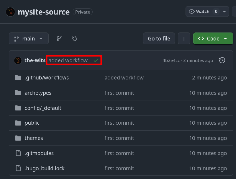 If everything is configured correctly, the workflow defined in gh-pages.yaml will be triggered. It will build the site with Hugo and publish only the static output to the public repository: