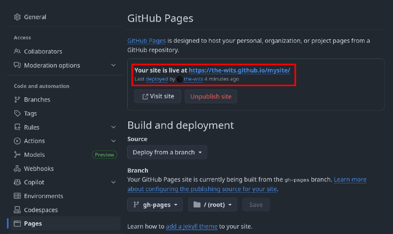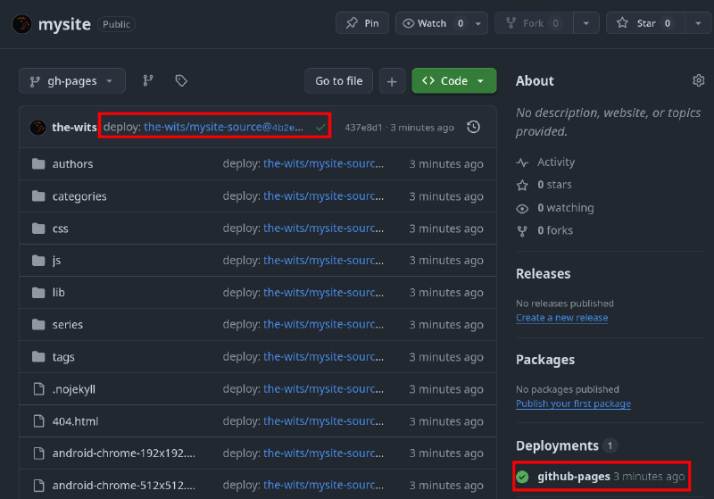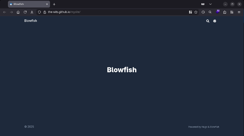 baseURL = "https://the-wits.github.io/mysite/"Save the changes and push them to the private repository. On each push to the main branch, the workflow will be triggered, and a few seconds later the site will be live: