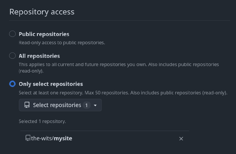 Give your PAT a name and restrict its access to only the public repository (mysite) created earlier: