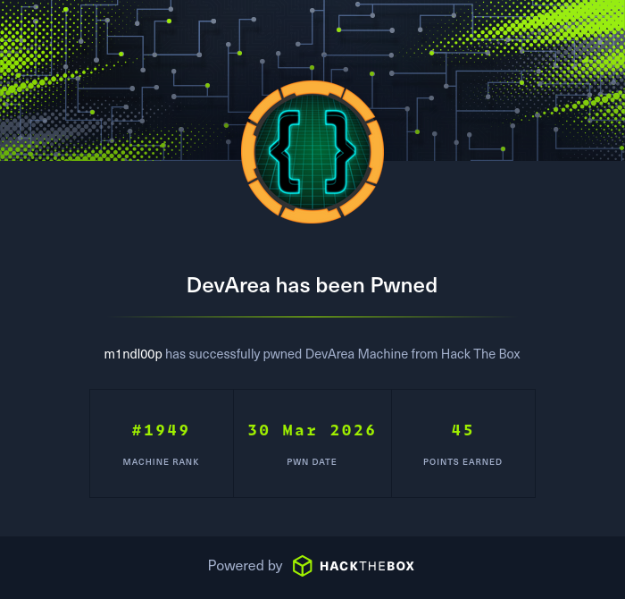 DevArea è una macchina Hack The Box (HTB) di difficoltà media, rilasciata il 28 Marzo 2026 durante la Season 10. Se stai cercando il writeup completo, torna su questa pagina dopo il ritiro ufficiale della macchina da HTB.