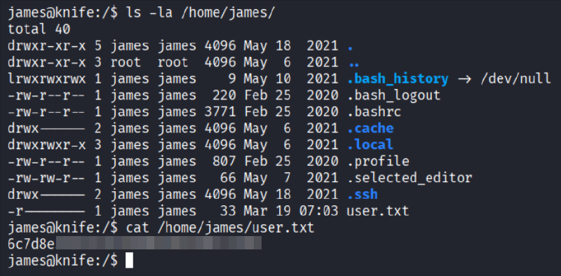stty rows <n> cols <m>Navigando il filesystem, si individua il file /home/james/user.txt, che contiene la flag dell’utente: